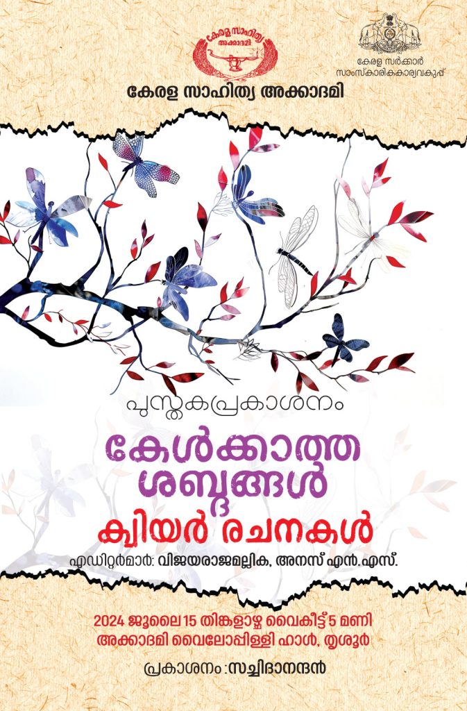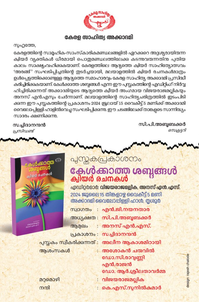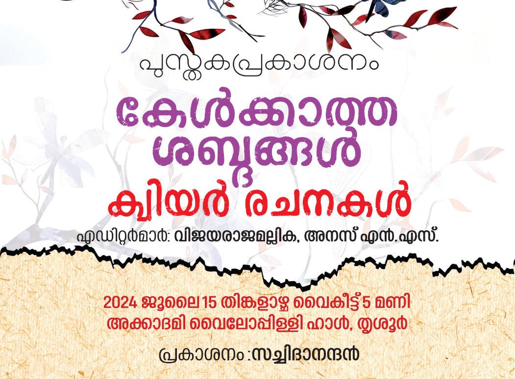 വിജയരാജമല്ലിക, അനസ് എന്.എസ്. എന്നിവര് എഡിറ്റുചെയ്ത് കേരള സാഹിത്യ അക്കാദമി പ്രസിദ്ധീകരിച്ച ക്വിയര് രചനകളുടെ സമാഹാരം കേള്ക്കാത്ത ശബ്ദങ്ങളുടെ പ്രകാശനം ജൂലായ് 15 തിങ്കളാഴ്ച വൈകുന്നേരം അഞ്ചുമണിക്ക് കേരള സാഹിത്യ അക്കാദമി വൈലോപ്പിള്ളി ഹാളില്വച്ച്.